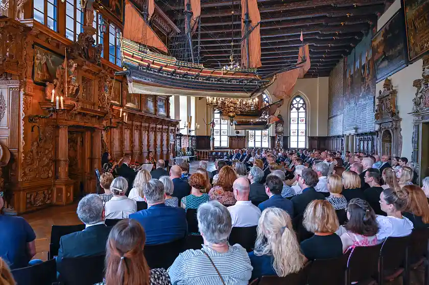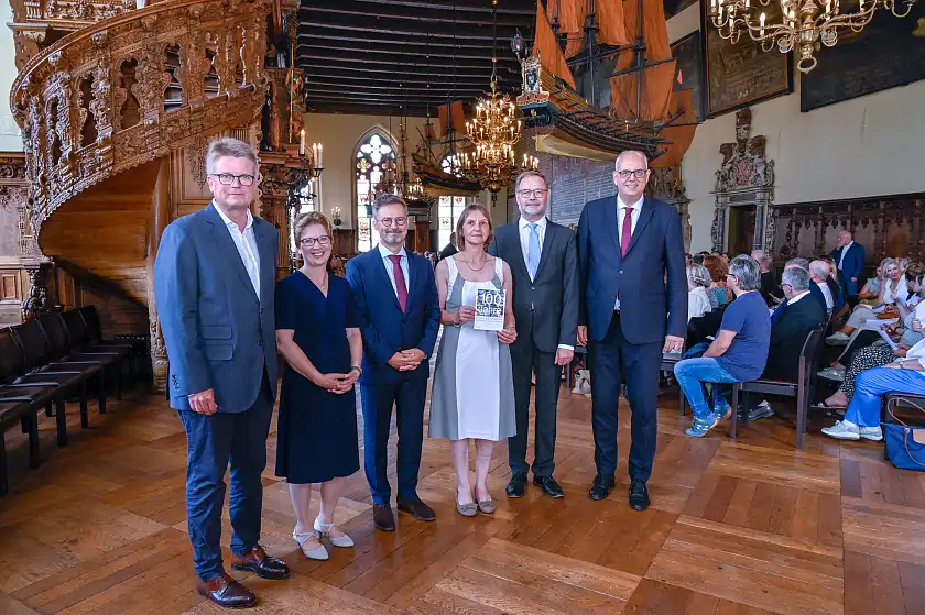 100 Jahre später wurde dieses ganz besondere Jubiläum am 29. August 2024 mit einem Festakt und einem Jubiläumsband gewürdigt. Zahlreiche Gäste aus der gesamten Bundesrepublik und alle Mitarbeiterinnen und Mitarbeiter waren der Einladung des Präsidenten des Senats der Freien Hansestadt Bremen, Bürgermeister Dr. Andreas Bovenschulte, und der Senatorin für Justiz und Verfassung, Dr. Claudia Schilling, gefolgt, um in der Oberen Rathaushalle die Anfänge, Herausforderungen und die Zukunft der Bremer Verwaltungsgerichtsbarkeit zu feiern. Musikalisch begleitet wurde das Jubiläum vom Streichquartett des Philharmonischen Orchesters Bremerhaven.